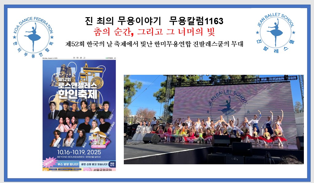 오전 11시 행사는 시작되었고 한미무용연합회 (KOA Dance Federation )는 단체를 소개하는 동영상과 함께, 산하단체인 진발레스쿨 단원들이 발레와 한국무용공연을 하였다. 4살 유아부터 75세 시니어 발레리노까지 18여 명단원들이 무대에 함께 올랐다.