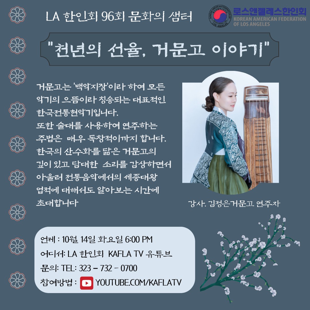 ‘문화의 샘터’는LA 한인회가 매달 둘째 주 화요일에 정기적으로 진행해온 온라인 문화예술 프로그램으로, 음악, 무용, 미술 등 다양한 분야의 전문가들을 초청해 한인 동포와 지역사회에 예술적 감동과 배움의 기회를 나누는 열린 문화 공간으로 자리잡아 왔습니다. 지금까지 총 93회를 이어오며 꾸준한 관심과 호응을 얻고 있으며, 한인사회의 문화 역량을 높이는 데 큰 역할을 하고 있습니다.