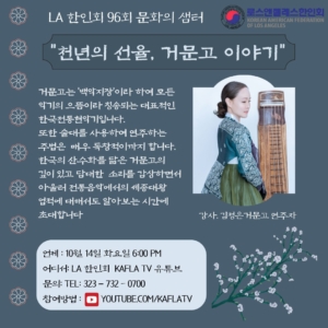 이러한 활동의 일환으로, LA 한인회(회장 로버트 안)는 오는 10월14일(화) 오후 6시에 제96회 ‘문화의 샘터 “천년의 선율, 거문고 이야기”