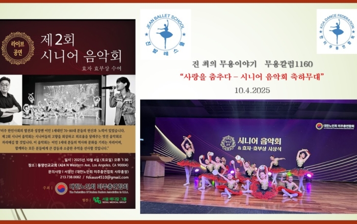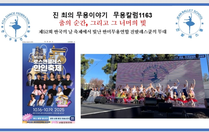 춤의 순간, 그리고그 너머의 빛 제52회 한국의 날 축제에서 빛난 한미무용연합 진발레스쿨의 무대 올해 제52회 한국의날 축제는 그 어느해보다 뜨거웠다. 전 세계를뒤흔드는 K-POP의 열풍 속에서우리는 다시 한 번한국 문화가 세계의 중심에서 있음을 실감했다. 축제 현장은 한류의 물결로가득 찼고, 한국인의 예술성과열정이 전 세계인들과 함께어우러지는 거대한 축제의 장이되었다. 4일간 이어진 행사에는수많은 관객이 몰려와 한국의전통과 현대가 아름답게 어우러진무대를 즐기며 자부심과 감동으로하나가 되었다. 그 중심에 진발레스쿨이있었다. 6가 하버드에 위치한진발레스쿨은 발레, 아크로바틱 케이팝 댄스, 한국무용 등 다양한 장르를아우르며 다인종이 함께 춤을배우는 무용 전문기관이다. 올해도 진발레스쿨은 한미무용연합과 함께축제의 주요 무대를 장식했다. 3세 유아부터80세 시니어까지, 세대를 넘어선 55명의 무용수들이 발레와한국무용을 결합한 창작무용을 비롯해총 8개의 작품을선보이며 관객의 마음을 사로잡았다. 무대는 단순한 공연이 아니라우리 안의 역사와 정체성을되살리는 예술의 시간이었다. “대한이 살았다”, “아리랑 판타지” 같은 창작 작품은삼일절의 의미를 모르는2세들에게 발레의 언어로 조용히말을 걸었다. 몸으로 전하는메시지는 말보다 깊고 강렬했다. 그것은 무용이 시대와세대를 넘어 진심을 전할수 있는 가장 순수한언어이기 때문이다. 무엇보다도 이번 무대에는 22년을 함께해온1,2,3 프리스쿨의 아이들이 함께했다. 진발레스쿨은 LA의 17곳 유치원에서매주 발레를 가르치며 어린이들에게예술의 꿈을 심어주고 있다.그중에서도 1,2,3 프리스쿨은 진발레스쿨과22년째 함께하며 아이들의‘첫 발레’를 지켜본소중한 파트너이다. 그리고 놀랍게도, 22년 전1,2,3 프리스쿨에서 발레를 배우던 그어린 제자가 이제는 어머니가되어 자신의 아이의 손을잡고 다시 진발레스쿨의 문을두드린다. 시간은 흐르고 세대는바뀌었지만, 그때 그 아이의눈빛 속 설렘은 이제그 어머니의 아이에게서 되살아난다. 무용은 이렇게 세대를넘어 흐르는 예술의 강이다. 어제의 제자가 오늘의학부모로, 오늘의 아이가 내일의예술가로 이어지는 아름다운 순환, 그 따스한 인연 이야말로진발레스쿨이 22년 동안 지켜온가장 빛나는 작품일 것이다.이번 축제를 통해함께해 주신 1,2,3 프리스쿨의 두두린다 원장님께 진심으로 감사를드린다. 한결같은 마음으로 아이들의첫 발레를 응원해 주시고, 예술의 씨앗을 함께키워주신 그 따뜻한 손길이있었기에 오늘의 진발레스쿨이 있을수 있었다. 공연은 단 몇분이지만, 그 뒤에는 수없이반복된 연습과 무용수들의 인내가 필요하다. 음악, 조명, 표정, 의상까지 완벽한조화를 이루기 위한 노력의시간들. 그 과정 속에서 예술의본질이 깃든다. 완벽을 향한그 길은 결코 쉽지않지만, 바로 그 과정이무용의 참된 아름다움이다. 리허설이 있던 아침, 스튜디오는 이미 축제의 열기로가득했다. 발레 튀튀를 입은아이들은 서로의 손을 잡고웃음을 터뜨렸고, 학부모들은 준비한음식을 나누며 마치 가을소풍처럼 즐거운 시간을 보냈다. 그 평범하고 따뜻한 순간속에 예술의 순수한 기쁨이있었다. 진발레스쿨은 지난 22년 동안한국의 날 축제에 꾸준히참여하며 예술을 통해 한국인의자긍심과 문화를 전해왔다. 세월이 흘러도 변하지 않는것은 ‘춤을 사랑하는마음’이다. 무대의 조명은 꺼졌지만, 진발레스쿨의 열정은 여전히 빛나고있다. 춤은 멈추지않는다. 그것은 삶의 호흡이며, 세대를 잇는 다리이자, 우리 존재의 가장아름다운 언어이기 때문이다. https://youtu.be/wxS7KCQjGmU www.koadance.org www.balletjean.com 한미무용연합회. 진발레스쿨 3727 West. 6th Street #607. LA CA 90020 Tel: 323-428-4429